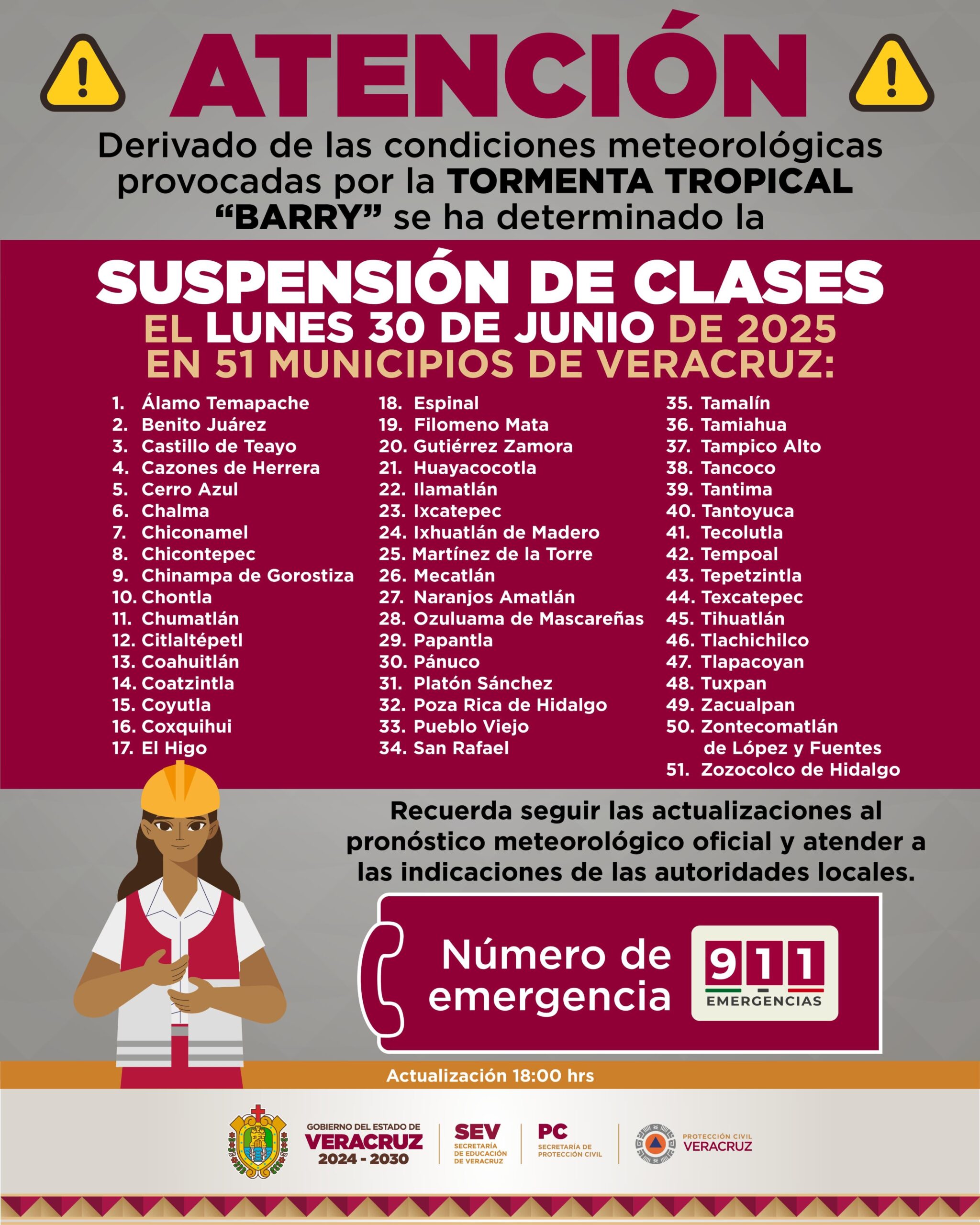 Xalapa, Ver. – Debido a los efectos de la Tormenta Tropical Barry, el Gobierno del Estado, a través de las secretarías de Educación y de Protección Civil, determinó suspender las clases y actividades escolares de este lunes, en los turnos matutino y vespertino, en 51 municipios, como medida preventiva.