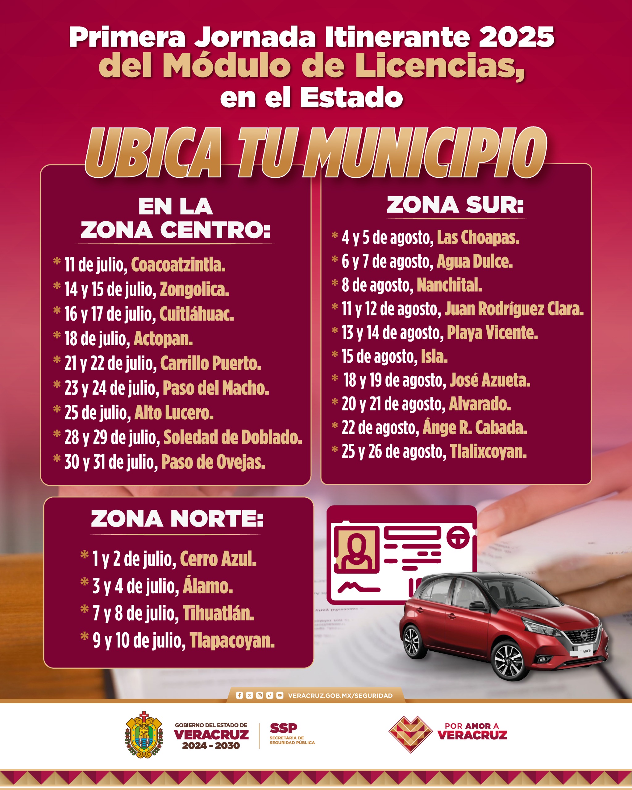 Xalapa, Ver..- La Secretaría de Seguridad Pública (SSP), a través de la Dirección General de Transporte del Estado, implementa del 01 de julio al 26 de agosto la Primera Jornada Itinerante 2025 del Módulo de Licencias, acercando este servicio a diversas regiones y facilitar el trámite a la población.
