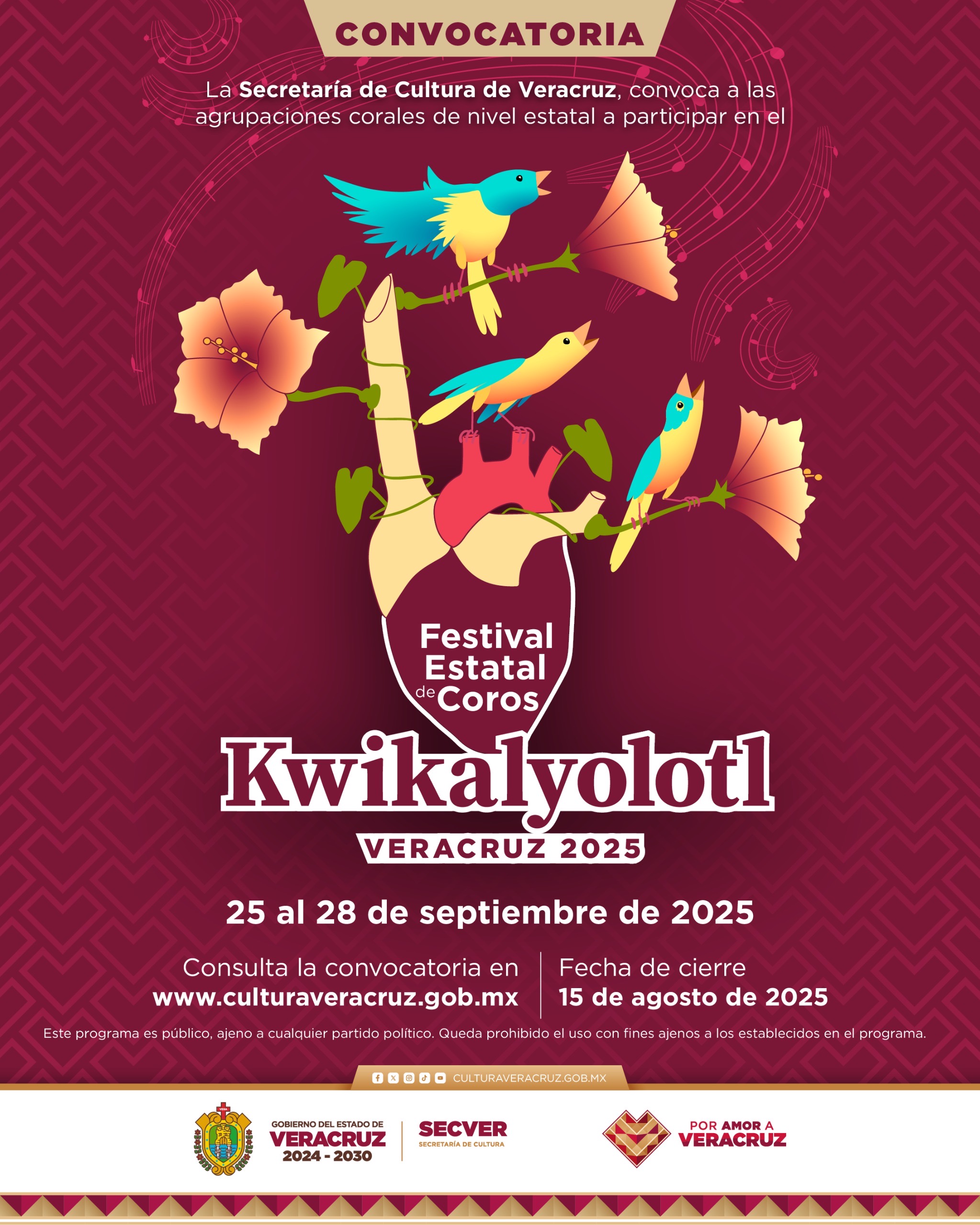 Xalapa, Ver.- La Secretaría de Cultura de Veracruz (SECVER), a través de la Dirección de Formación y Desarrollo Artístico, invita participar en la convocatoria del Festival Estatal de Coros Kiwikalyolotl(Corazón que canta), a realizarse 25 al 28 de septiembre en Coatzacoalcos. La convocatoria estará abierta hasta el viernes 15 de agosto.