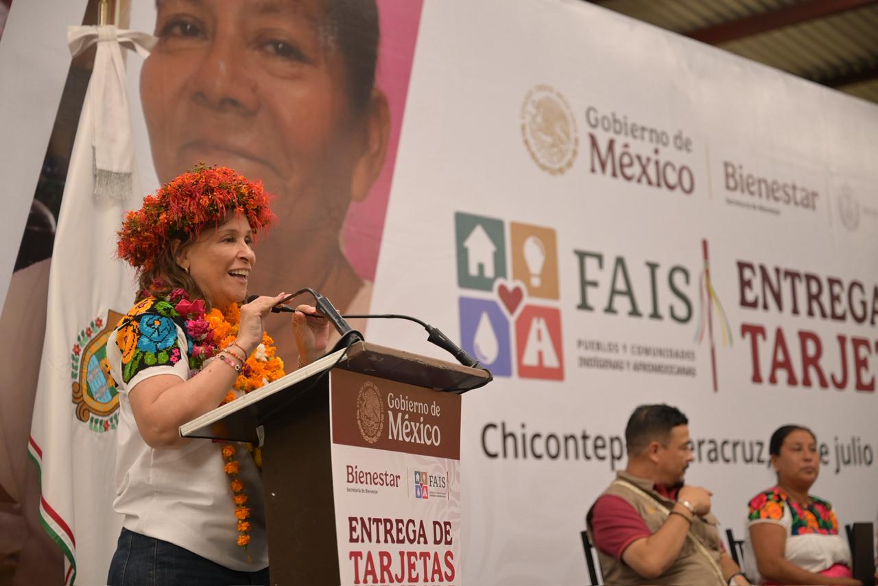 Chicontepec, Ver..- Desde la Huasteca veracruzana, la gobernadora Rocío Nahle García y la secretaria de Bienestar, Ariadna Montiel Reyes, encabezaron la entrega de 183 tarjetas bancarias con recursos del Fondo de Aportaciones para la Infraestructura Social para Pueblos y Comunidades Indígenas y Afromexicanas (FAISPIAM), con una inversión de 59 millones 731 mil 240 pesos.