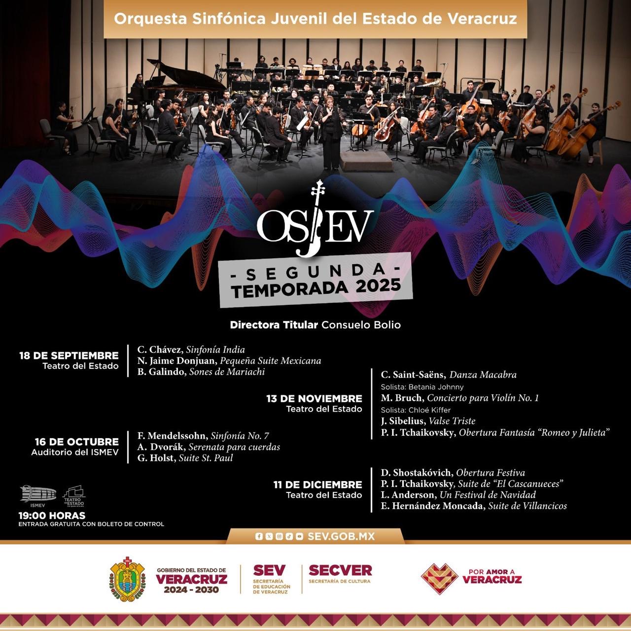 .– Las secretarías de Educación de Veracruz (SEV) y de Cultura (SECVER) invitan a la Segunda Temporada 2025 de la Orquesta Sinfónica Juvenil del Estado de Veracruz (OSJEV) del Instituto Superior de Música del Estado de Veracruz (ISMEV).