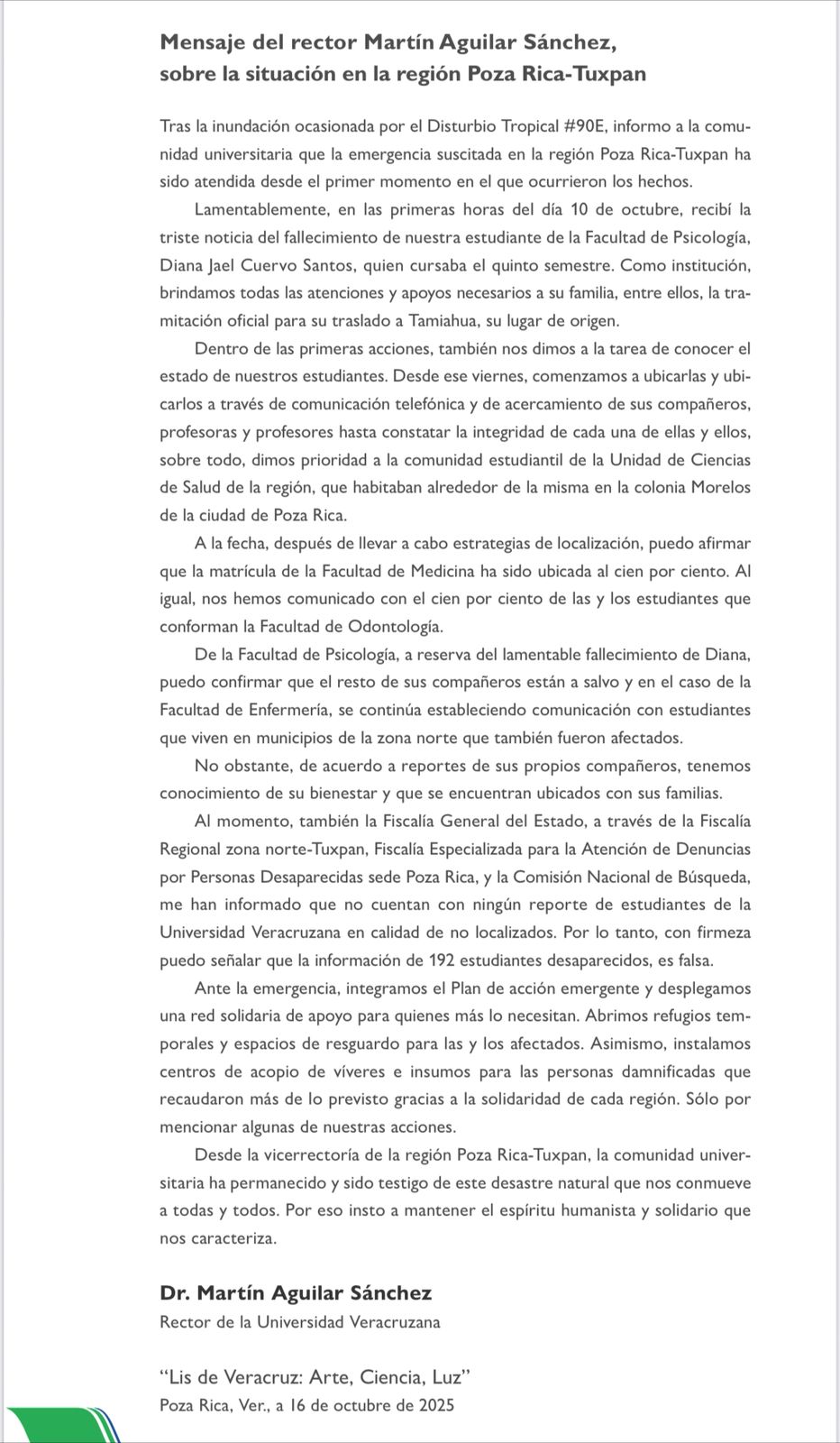 El rector de la universidad veracruzana, Martín Aguilar Sánchez emitió un comunicado sobre la situación en la región Poza Rica-Tuxpan