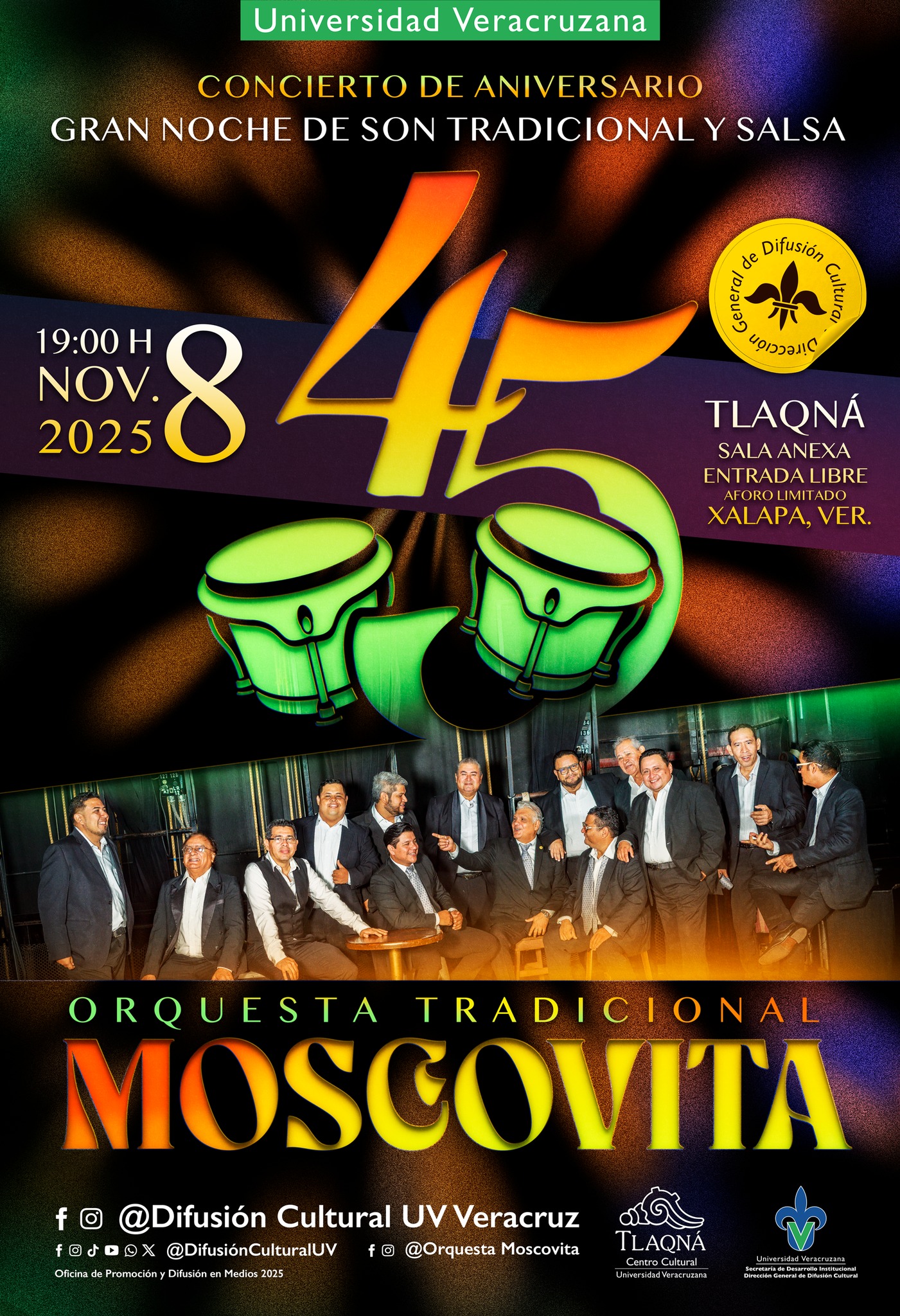 Este sábado, la Universidad Veracruzana (UV), a través de la Dirección General de Difusión Cultural, invita al público en general a festejar el 45 aniversario de la Orquesta Tradicional “Moscovita”.
