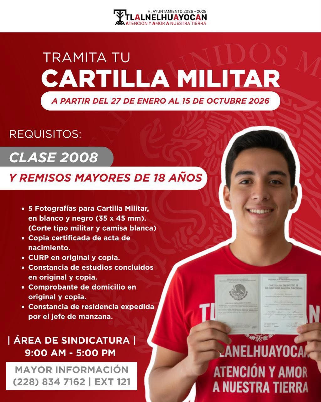 El H. Ayuntamiento de Tlalnelhuayocan invita a los jóvenes de la Clase 2008 y remisos a realizar su trámite de la Cartilla Militar.