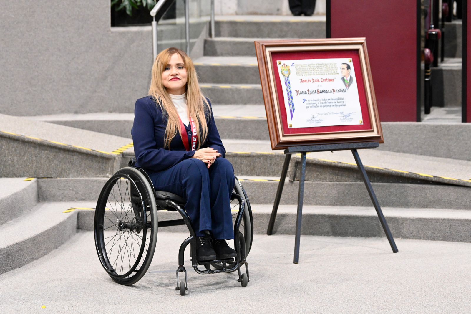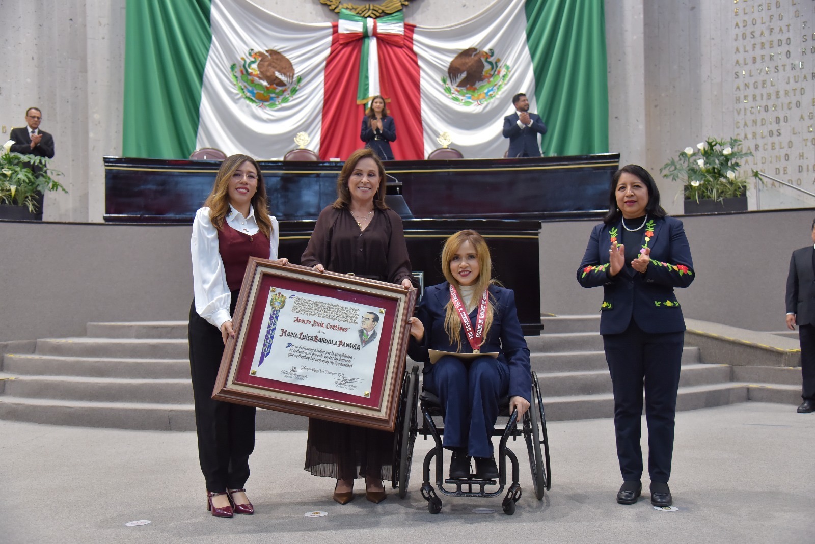 Xalapa, Ver.- Como reconocimiento a su dedicación en la lucha por la accesibilidad, la inclusión y el deporte y contra las barreras que enfrentan las personas con discapacidad, la LXVII Legislatura del estado entregó la medalla y diploma Adolfo Ruiz Cortines, edición 2025, a la ciudadana María Luisa Bandala Pantoja.