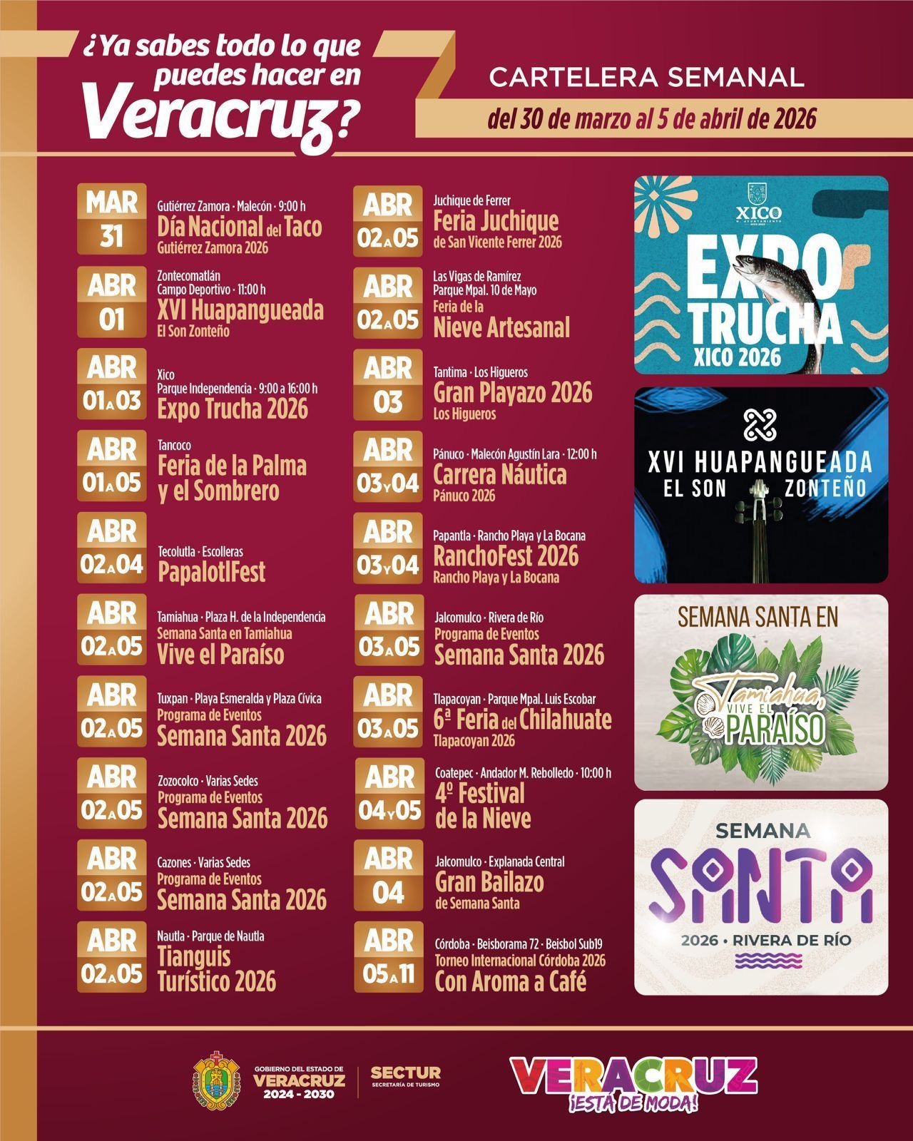 Del 02 al 05 de abril, se realizará el Tianguis Turístico 2026 en Nautla; la Feria Juchique de San Vicente Ferreren Juchique de Ferrer, y la Feria de la Nieve Artesanal en Las Vigas. El 03 de abril, en la localidad de Los Higueros, en Tantima, el Gran Playazo 2026; el 03 y 04 de abril en Pánuco la Carrera Náutica Pánuco.