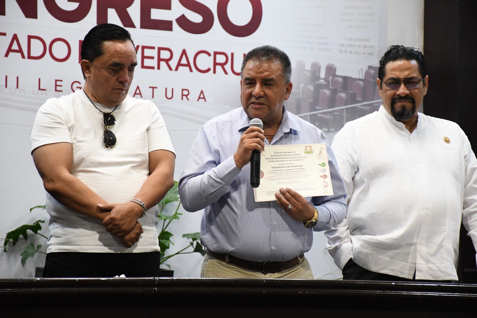 Durante el evento que se llevó a cabo en las instalaciones de la Legislatura del Estado, JoséAntonio Sangabriel Fernàndez hizo un público reconocimiento a dos banderillenses distinguidos: a la Maestra Yolanda Hernàndez Jiménez y a Don Fèlix Vàzquez Dìaz Pintos, por su “importante contribución al fortalecimiento cultural y educativo del municipio”.